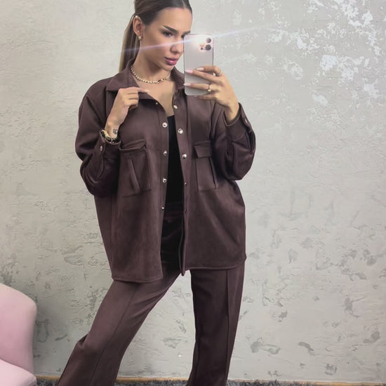 Set format din pantaloni și cămașă cu capse, realizat din material cu aspect de piele întoarsă. Textura moale și catifelată oferă un aspect elegant și modern, în timp ce croiala lejeră și închiderea cu capse adaugă confort și versatilitate. Perfect pentru ținute stylish de zi sau de seară.